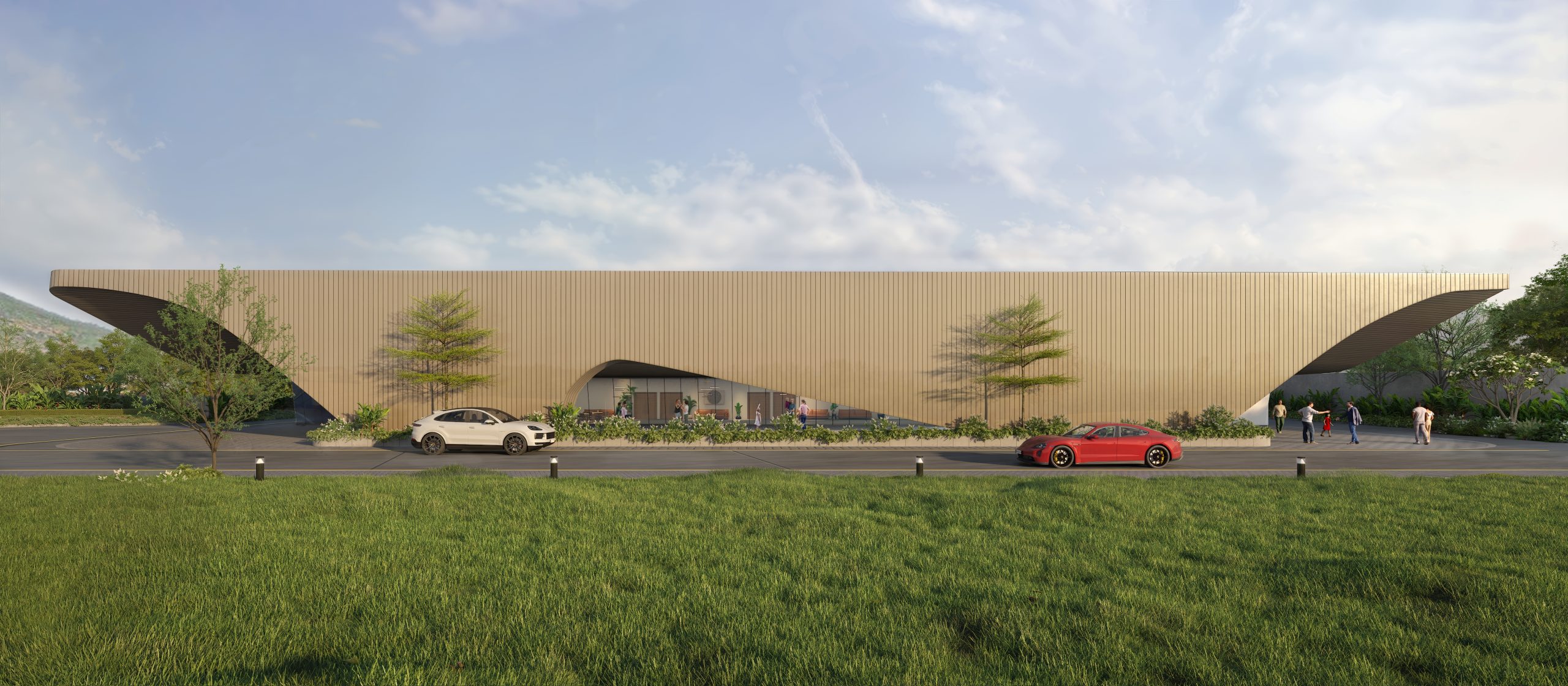 The building is characterized by a fluid, sculptural profile with sweeping roof planes that rise and dip gently, echoing the undulating contours of the Nandi Hills landscape. Instead of a monolithic volume, the mass is horizontally stretched and layered, giving the structure a low, grounded presence that visually blends with its natural surroundings.